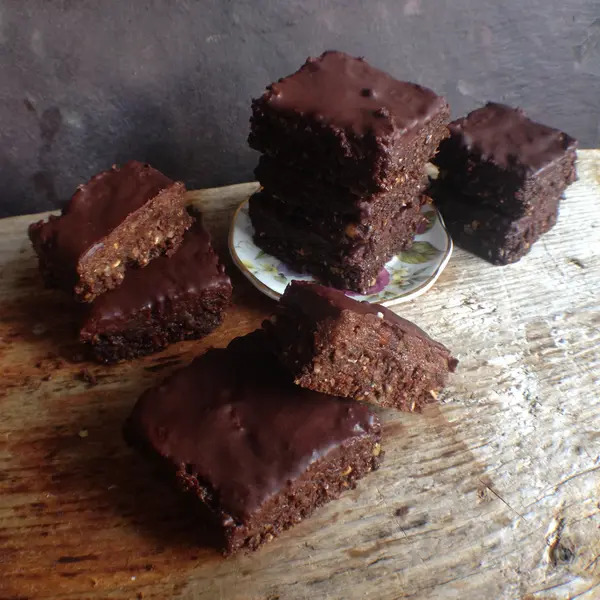 • Remove the brownies from the fridge / freezer and top with the melted raw chocolate or raw cacao liquor. Return to the fridge for at least 15 mins to set.